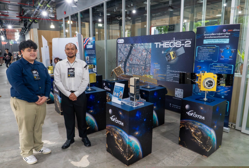 GISTDA exhibited models of more than eight Thai satellites, including the THEOS family of resource survey satellites currently in operation, as well as models of satellites developed entirely by Thai teams that are scheduled for launch in the coming years. GISTDA's satellite engineers explained how orbital data supports various applications, particularly flood monitoring and natural resource surveying.